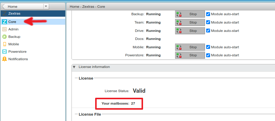 If you have Zextras Suite installed on your Zimbra infrastructure simply access the Zimbra Administration console, click on the ‘Zextras Suite’ entry on the left and then on ‘Core’. The number listed as ‘Your Mailboxes’ in the ‘License’ section of the page is the minimum number of mailboxes you need to license.