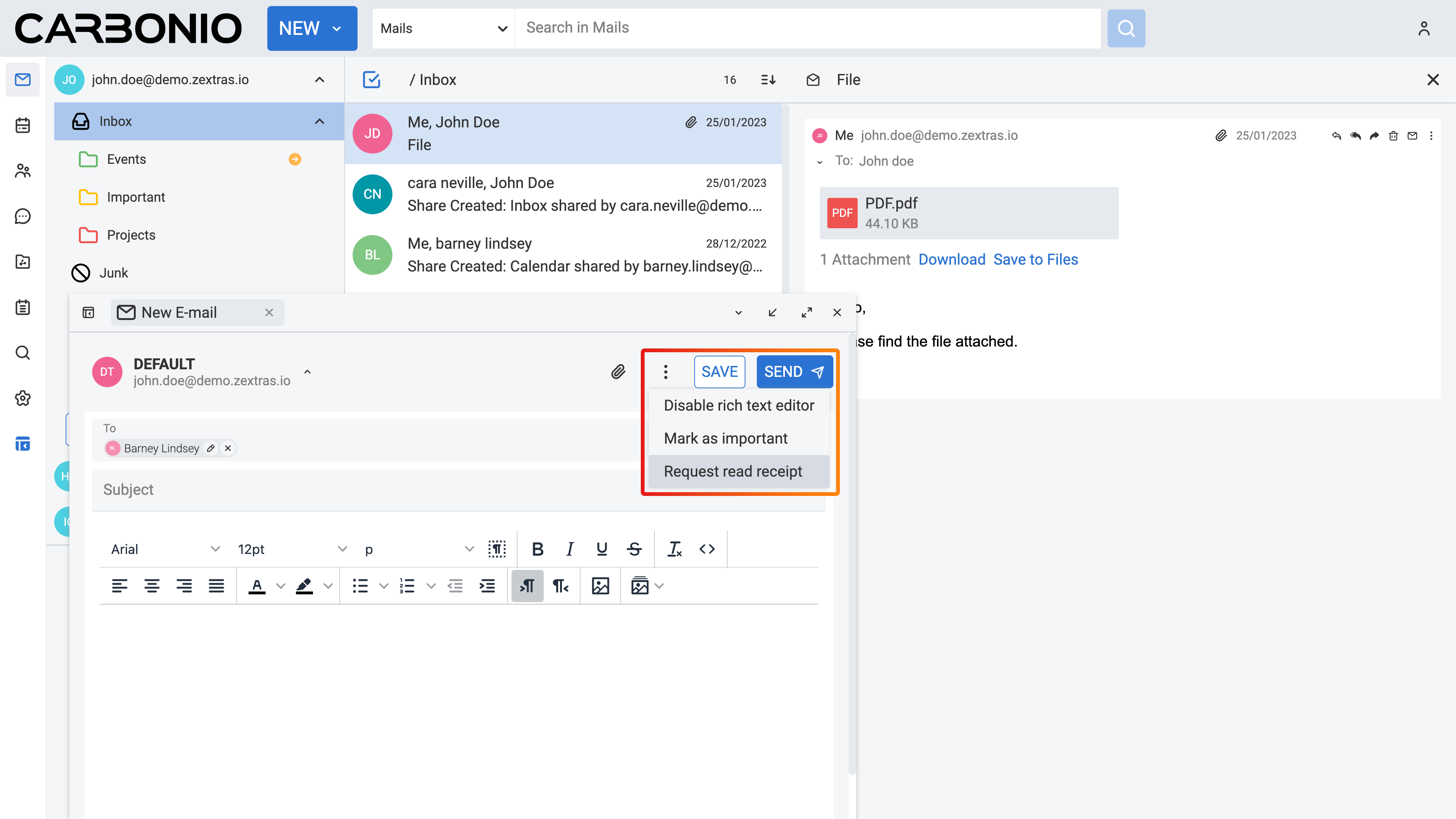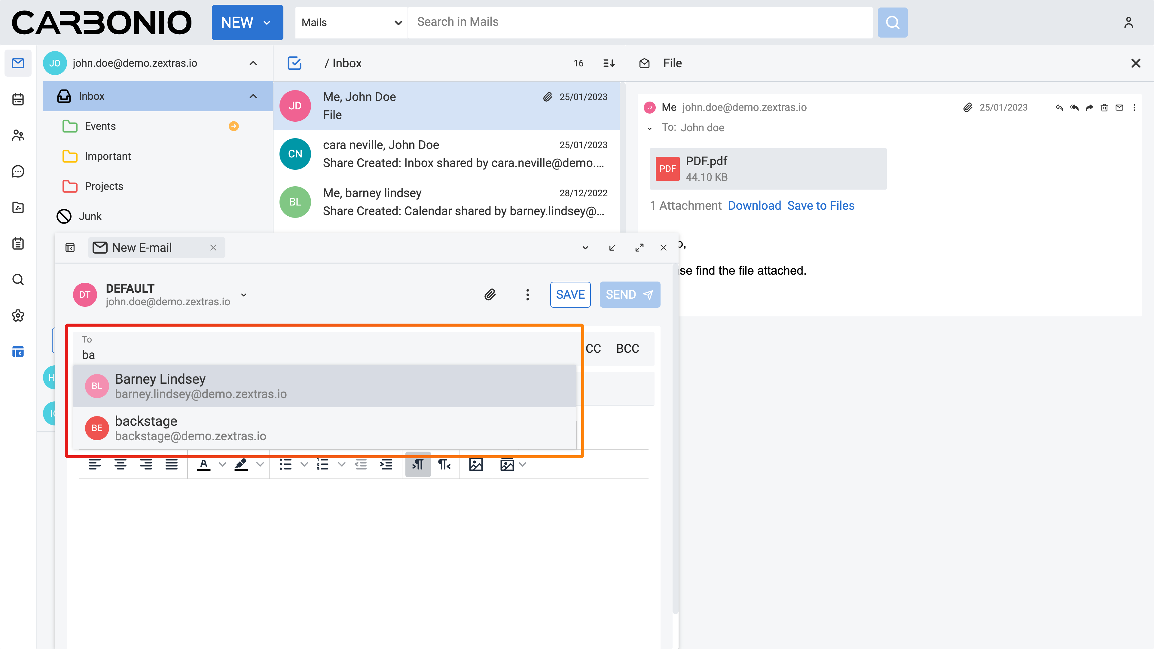 In this section, you will discover how to navigate Carbonio email composer and how to use its various features including working with attachments, addressing emails, using account personas, etc.