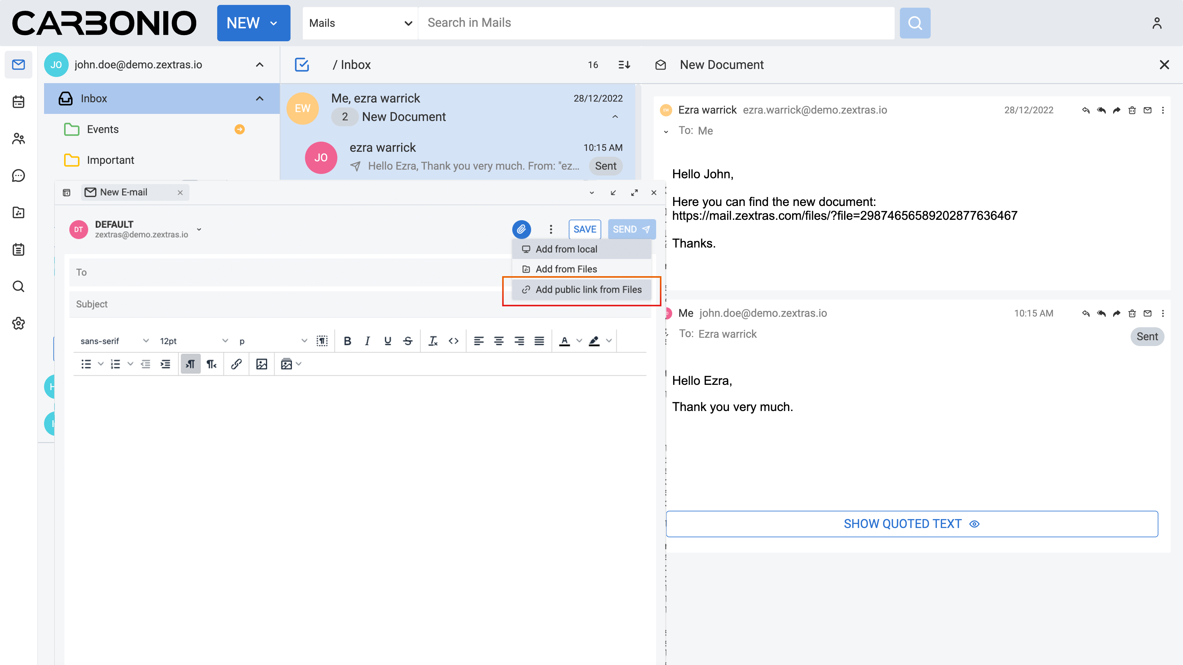 When you want to attach large attachments to an email, you may encounter some limitations. When you reach the size limit set by your admin for the attachments, using the “smart links” option, it is possible to convert every attachment in Smart Links by clicking the paperclip icon inside the composing board and choosing the “Add public link from Files option”.