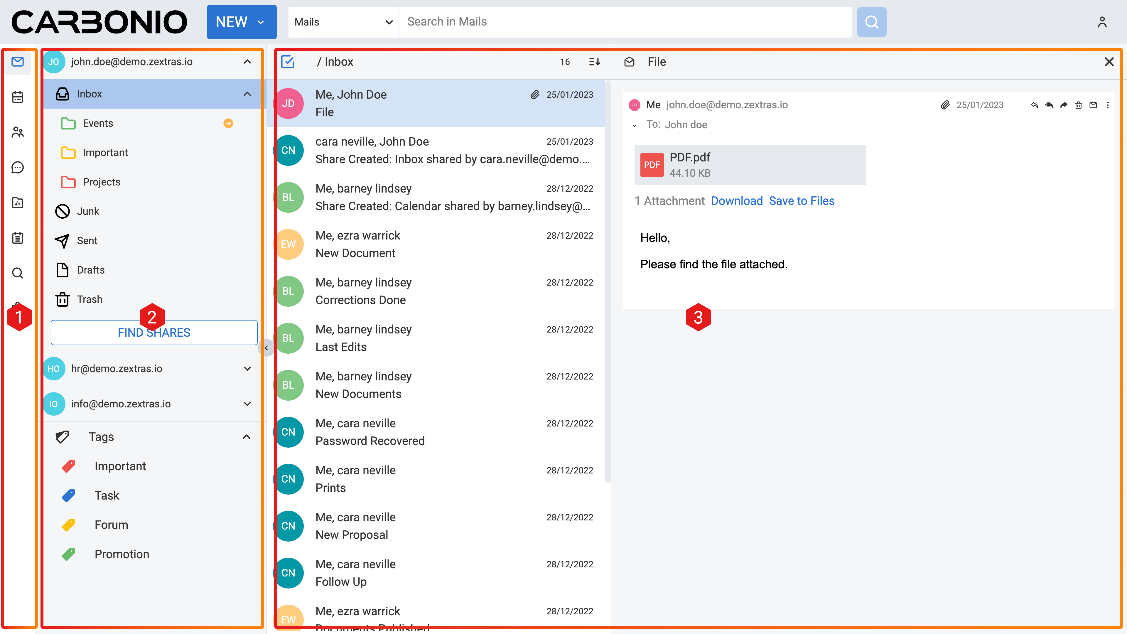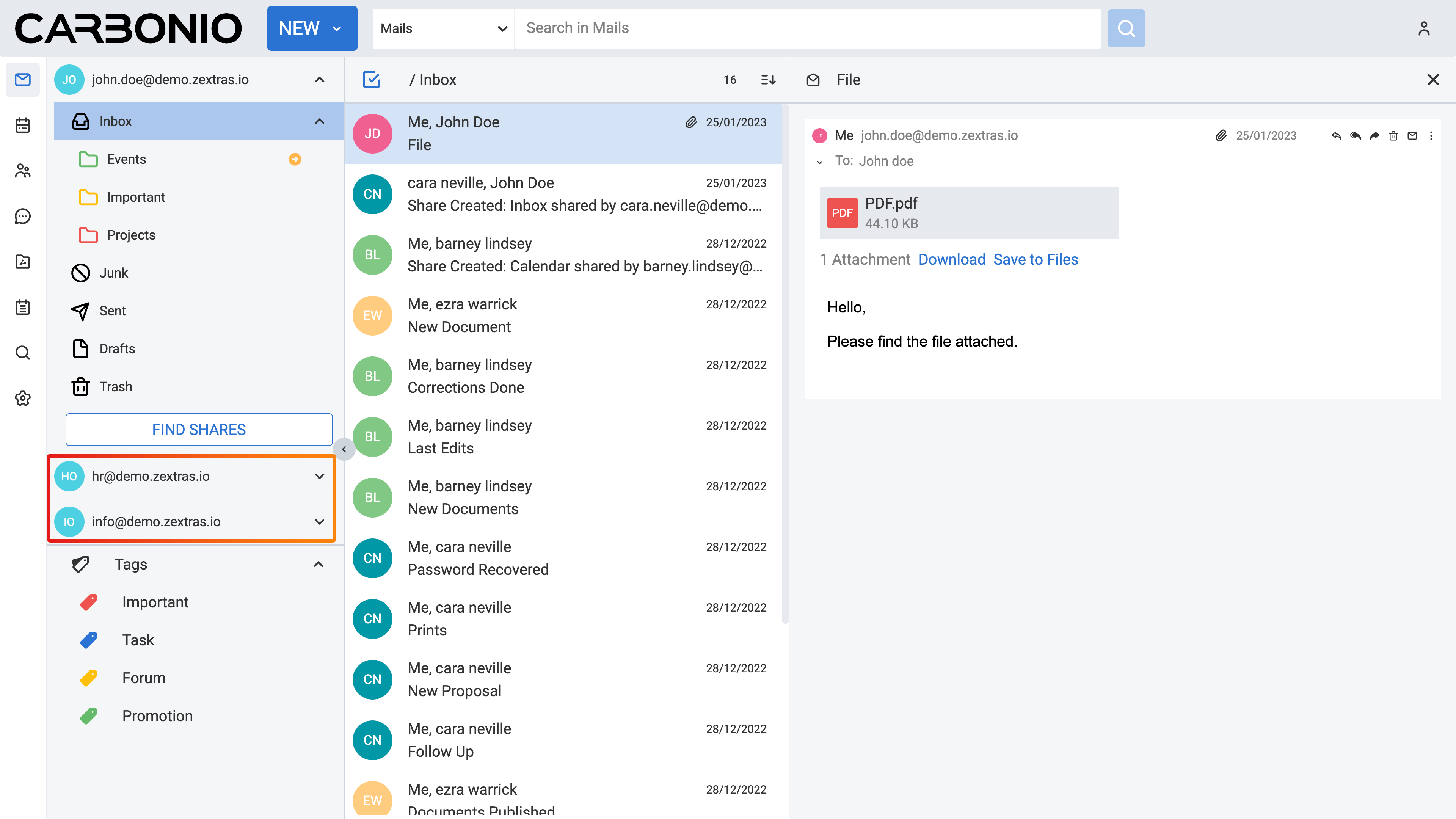 On the Carbonio web client, you have access to multiple accounts. Let’s say you have your personal account, as well as two additional accounts created for HR tasks and communications with your colleagues under the name “”, and another one named “” for external communications of the company. Only your system administrator can add these accounts and grant you access to manage them via your main account.