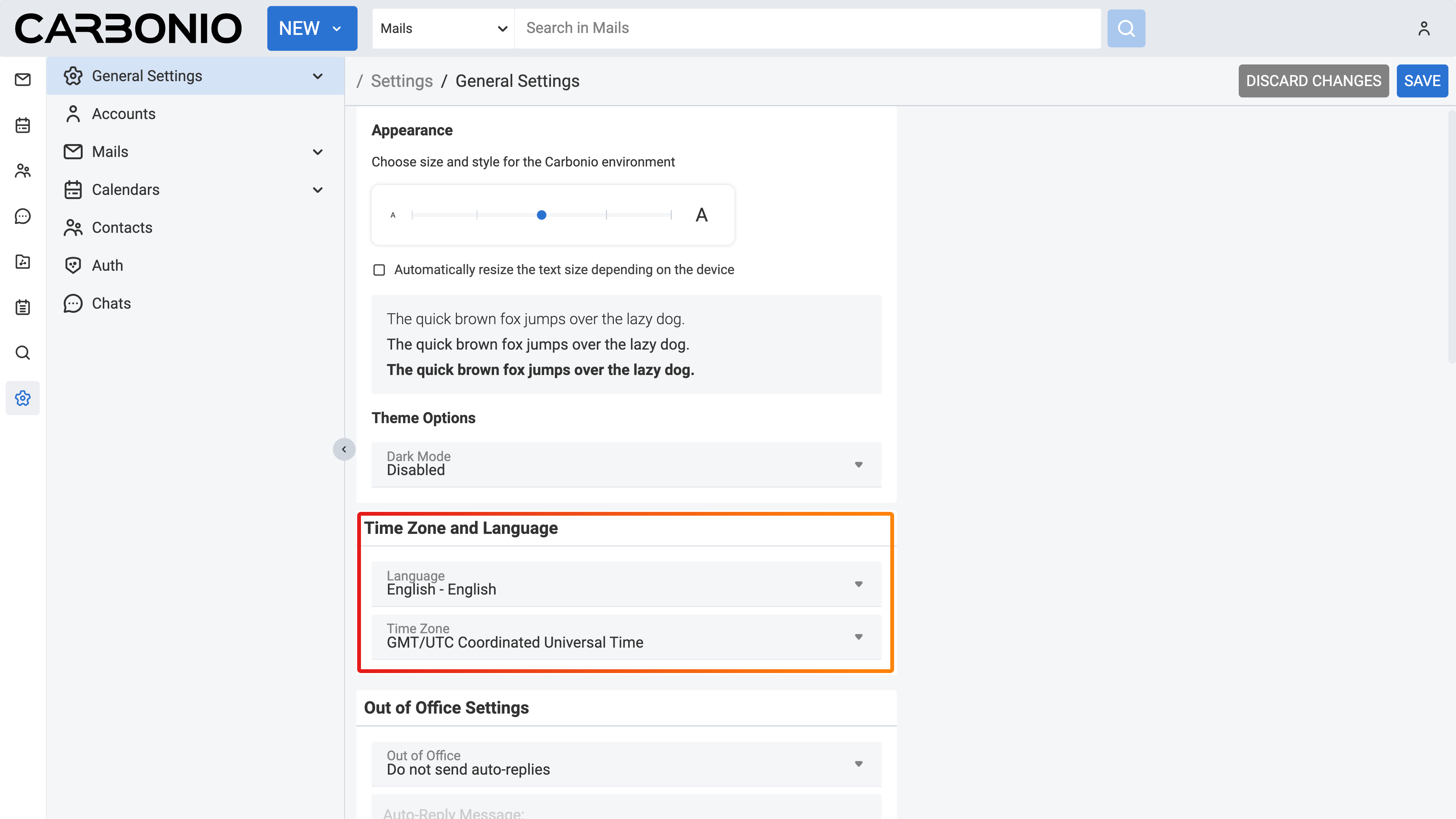 Before you start using the Carbonio web client, take a moment to personalize your account. You can customize visual aspects such as the theme, as well as other account settings like your time zone. Most of these options are conveniently accessible in the Settings menu. To access it, simply click the gear icon on the left sidebar, and then select General Settings.