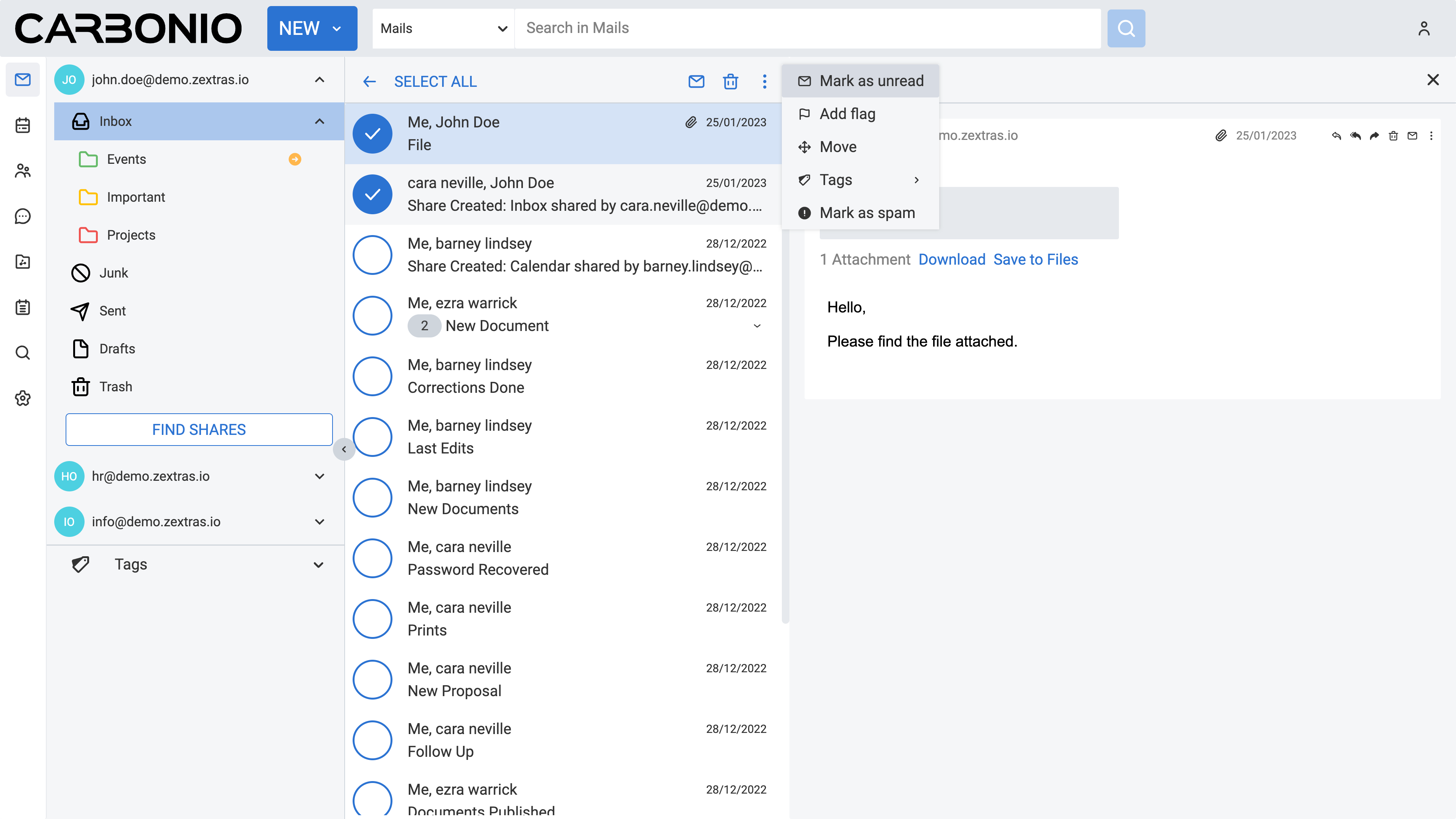 Le azioni disponibili per più email includono Segna come non letto, Contrassegna con un flag, Sposta ed Etichetta.