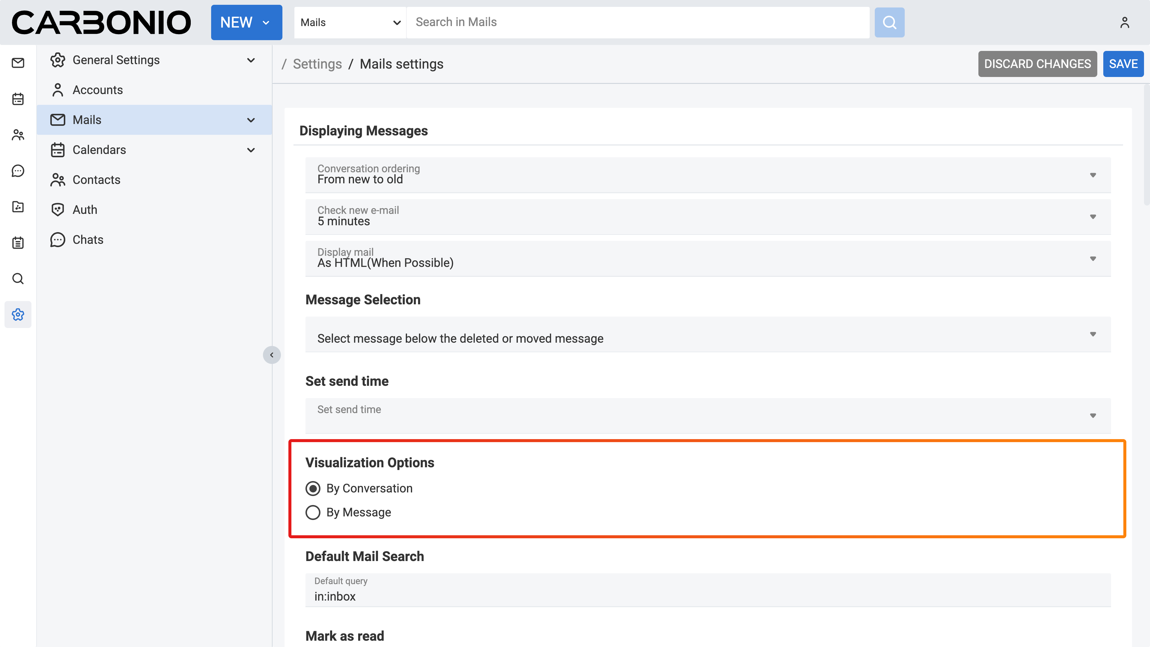 Per cambiare la visualizzazione delle email di Carbonio, scegliendo tra la visualizzazione per conversazione o per messaggi singoli: