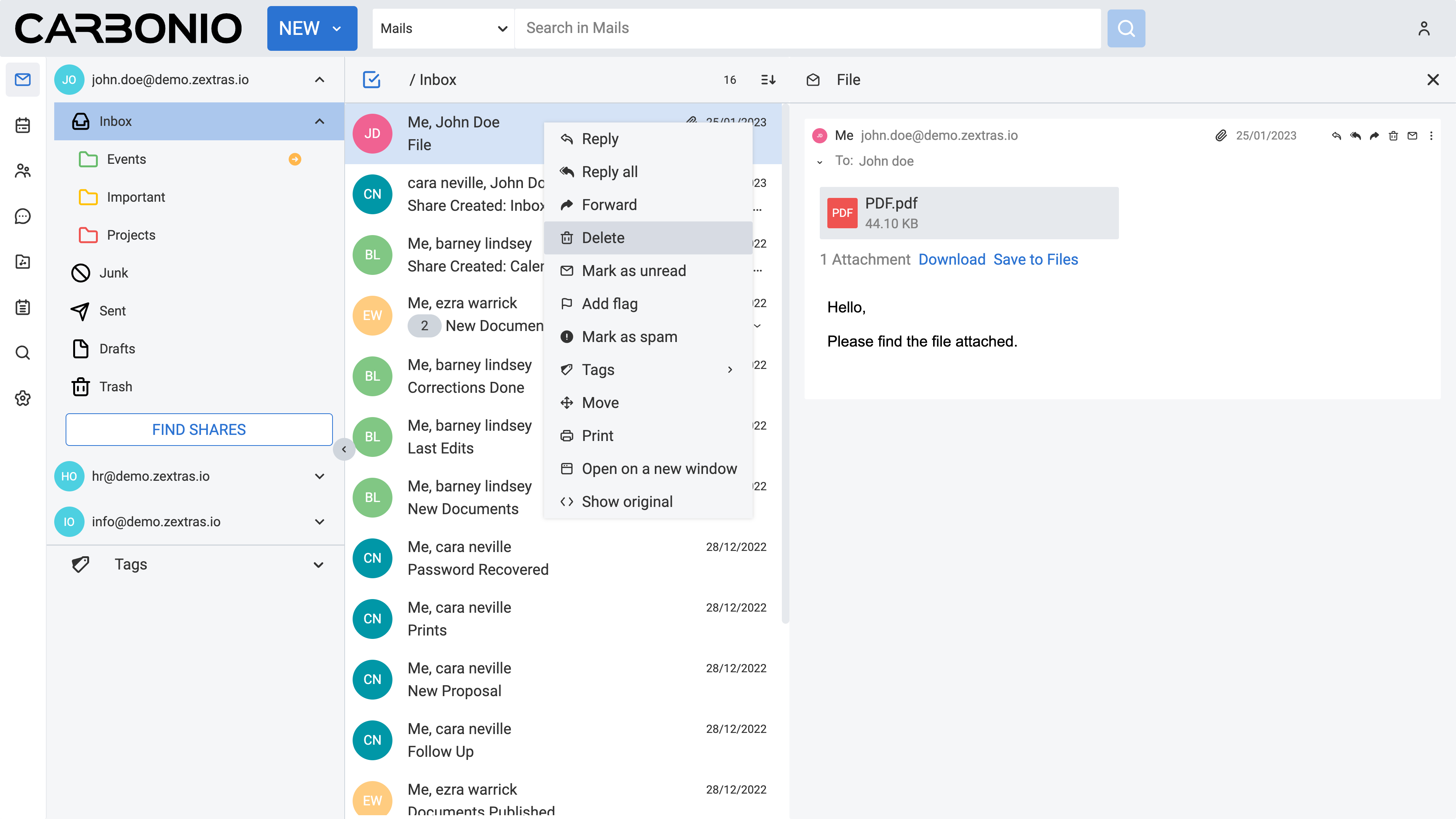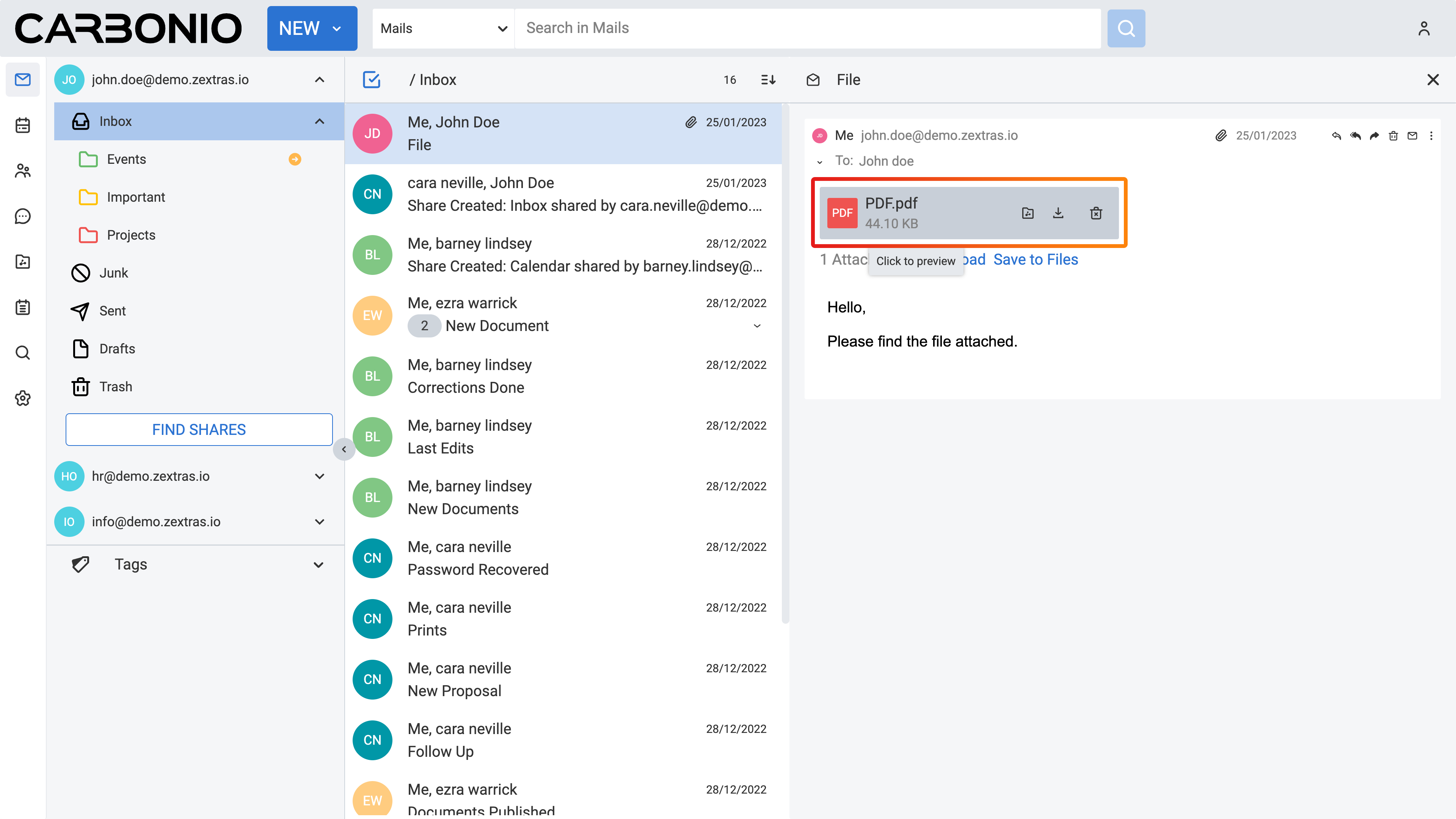 Le email possono contenere vari tipi di file allegati, come documenti testuali, fogli di calcolo, archivi ZIP, immagini, applicazioni eseguibili o qualsiasi altro file del computer memorizzato nella rete del mittente. I messaggi con allegati si distinguono grazie a un’icona di graffetta accanto alla riga dell’oggetto.