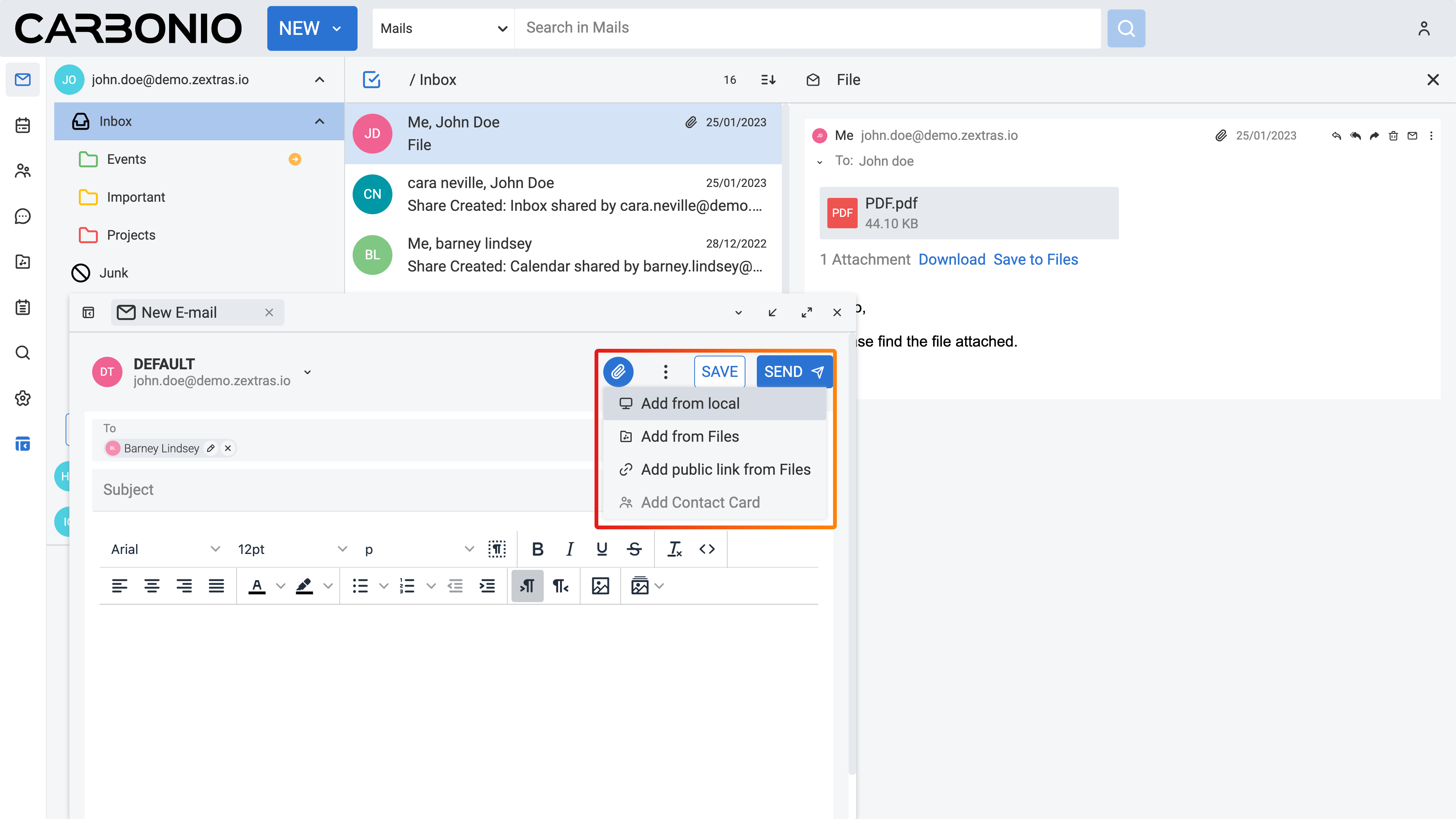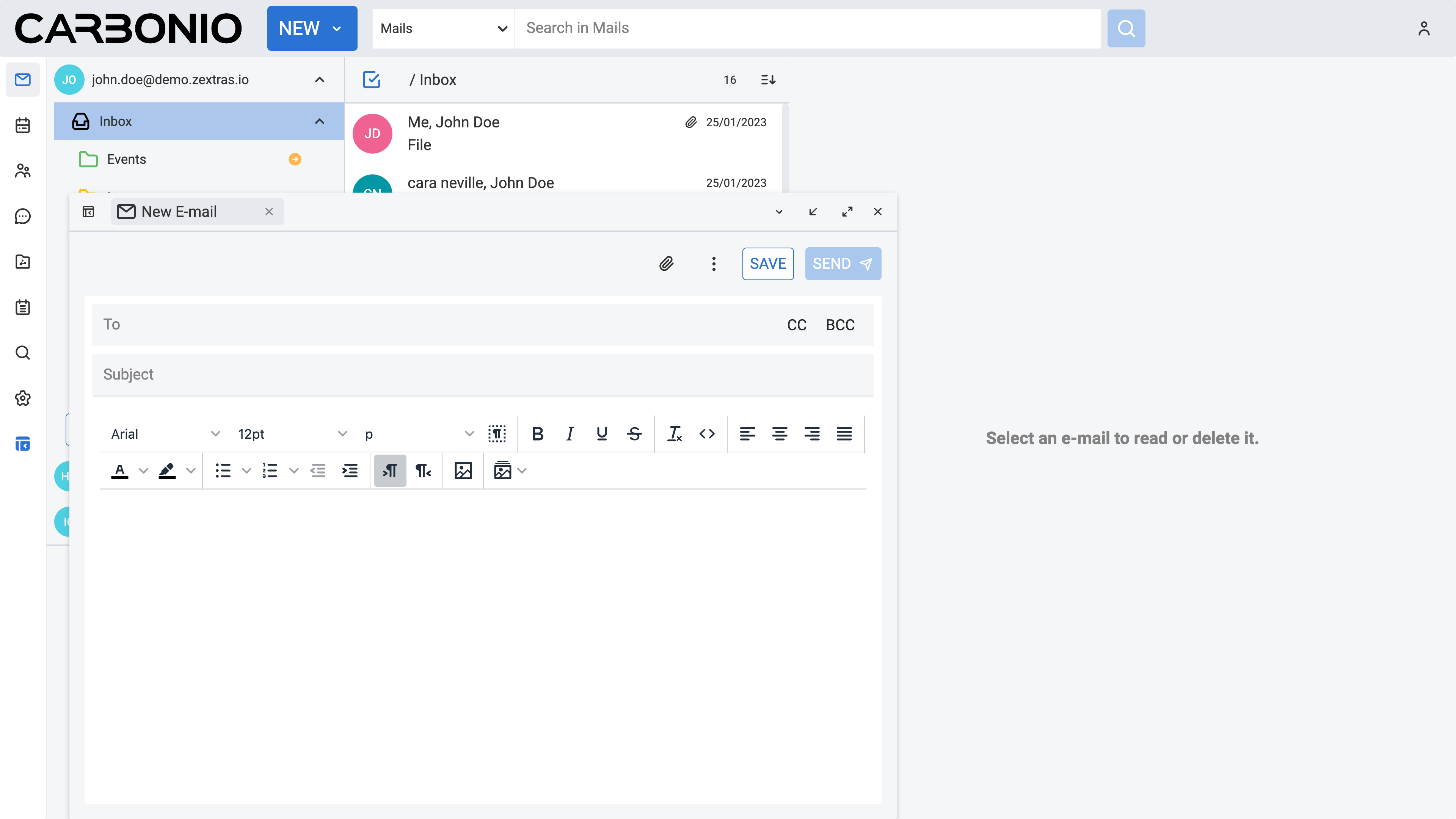 In questa sezione, scoprirai come navigare nel composers di email di Carbonio e come utilizzare le sue varie funzionalità, tra cui lavorare con allegati, indirizzare email, utilizzare le persone associate agli account, ecc.