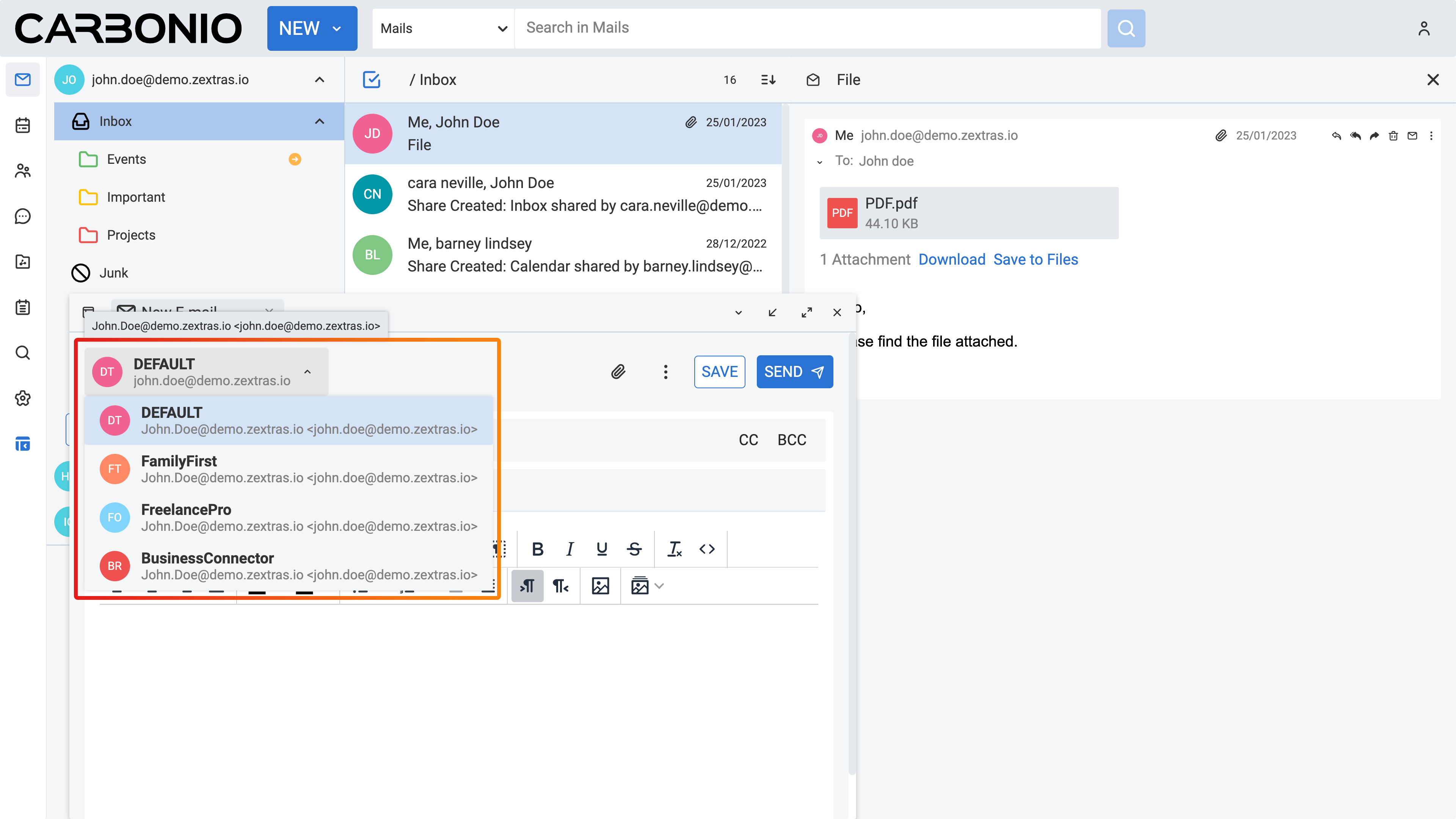 Un’identità email si riferisce alla possibilità di accedere a più account sul client web di Carbonio, consentendo di scegliere da quale account inviare l’email. In alternativa, se hai configurato un’altra personalità nelle tue impostazioni, puoi inviare messaggi da essa. In entrambi i casi, il destinatario vedrà l’indirizzo email o lo username dell’identità o della personalità selezionata come mittente delle email.