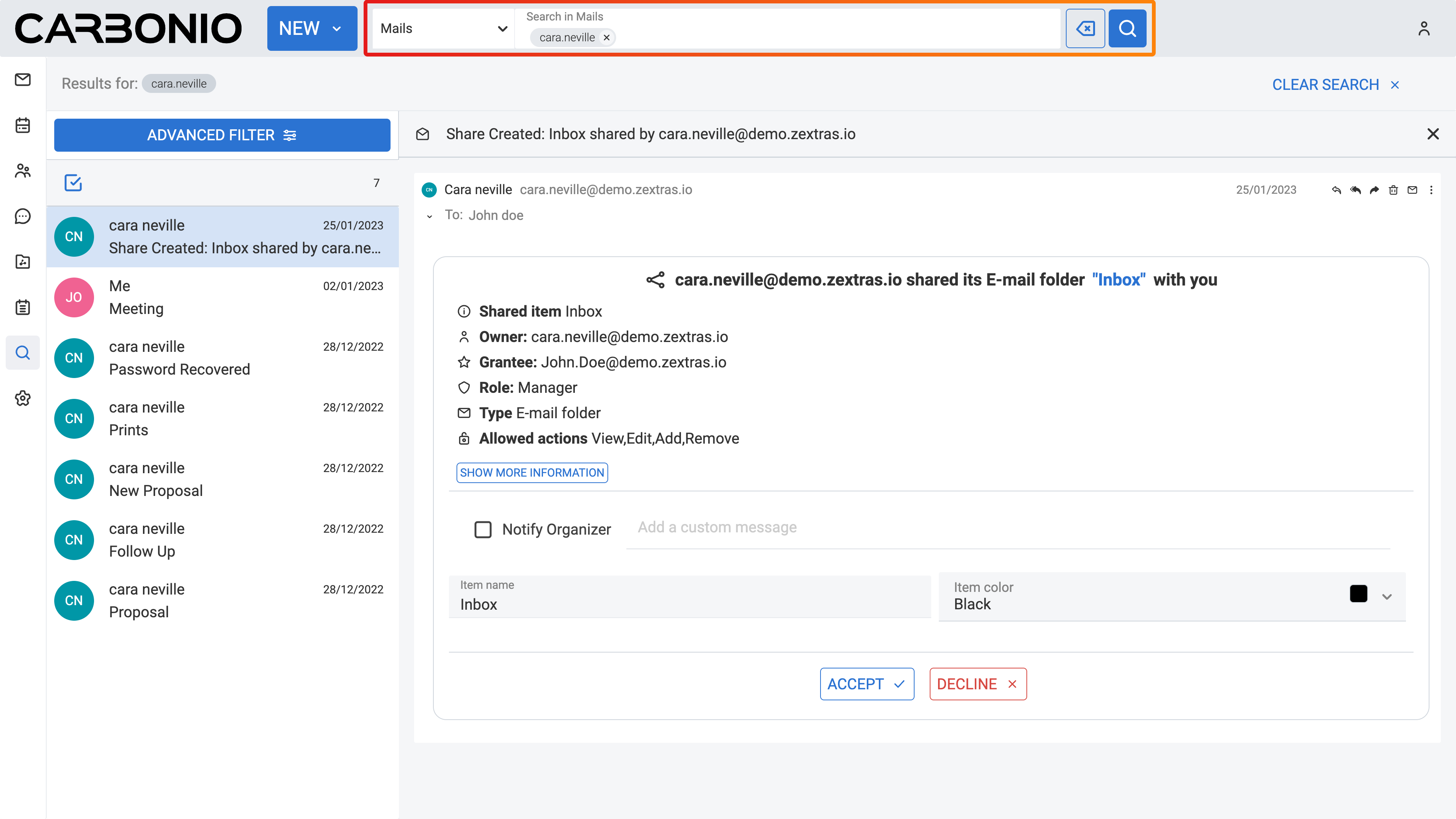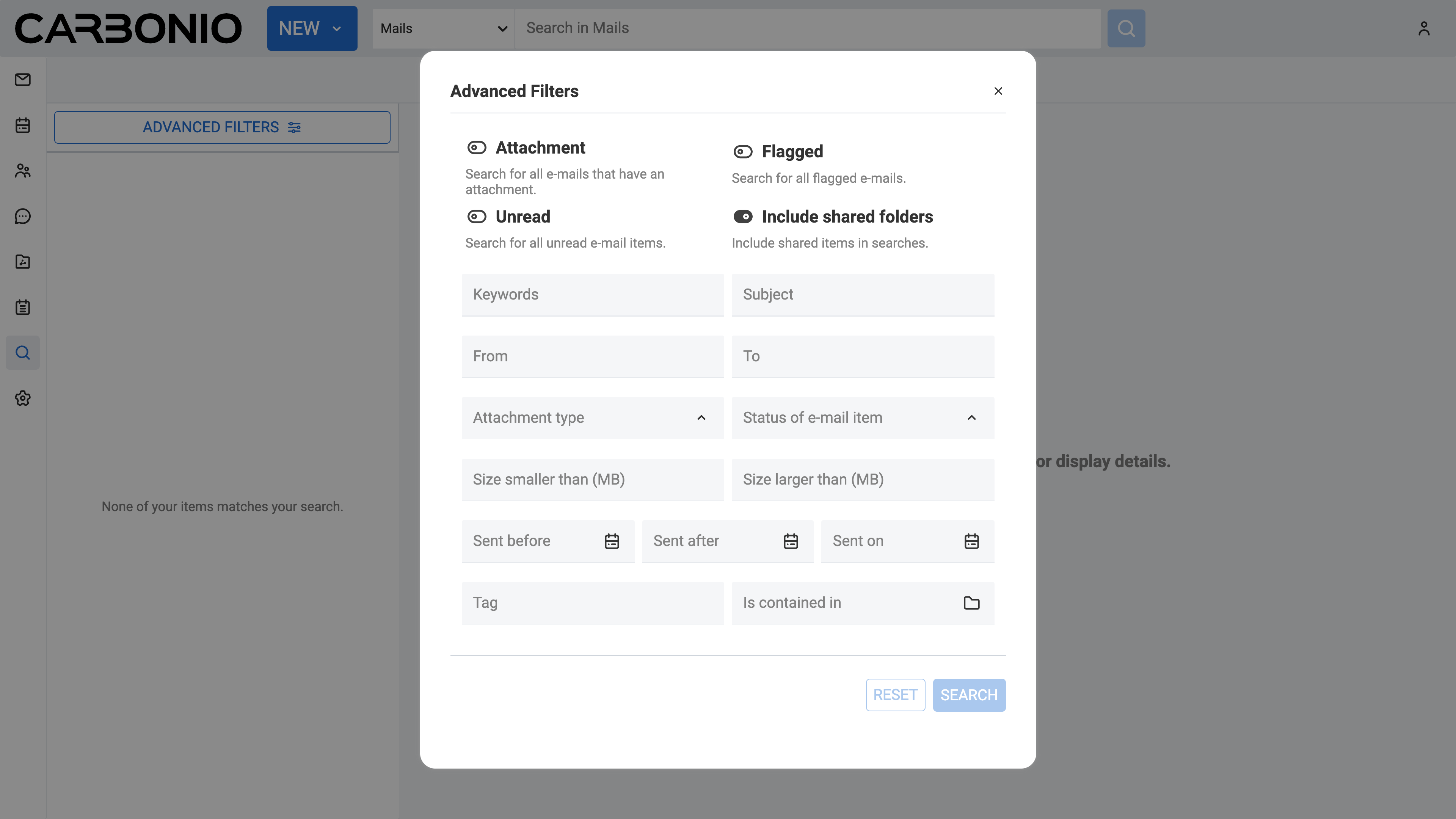 Queste funzionalità di ricerca aiutano a localizzare e gestire i dati efficacemente nel client web di Carbonio.